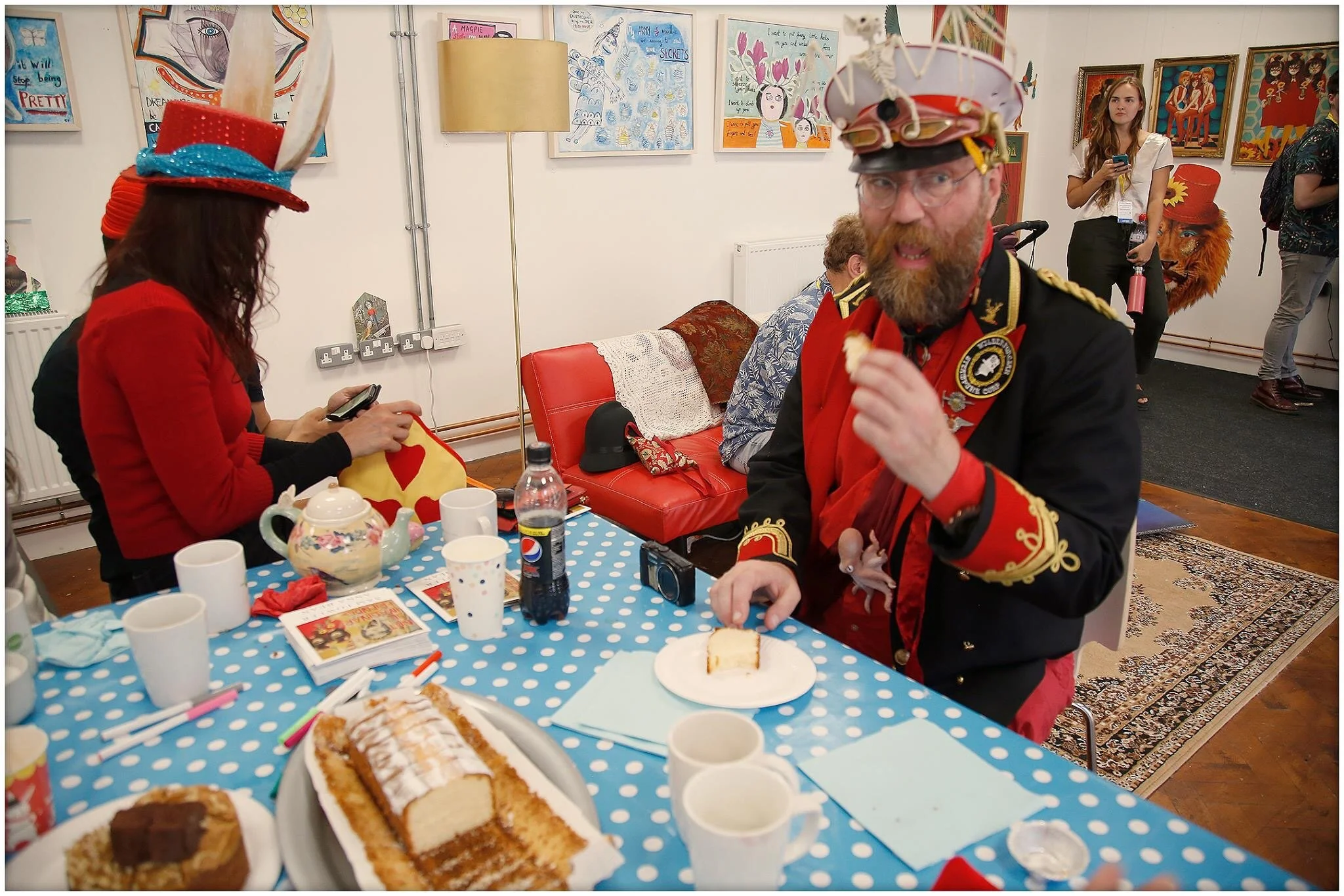 Queens House Showcase of pictures combining my photographic, animation and collage based work with the wonderful paintings of Sam Fowler. During the exhibition I staged an installation themed around the Mad Hatters Tea Party where visitors were invited to wear hats, eat cake, drink tea and draw pictures.
